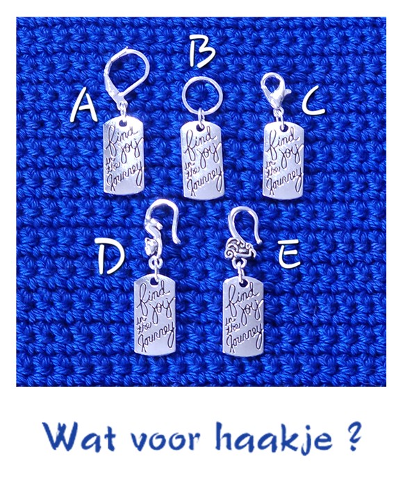 Na het zoveelste pakje was ik er helemaal klaar mee. Ik bedacht voor mijzelf de volgende oplossing: de charm als steekmarkeerder. Het nadeel is alleen dat een charm een klein haakje heeft, te klein voor de wat dikkere draad en eigenlijk te dik voor de hele dunne draad. Geen fijn gepriegel om die dan in je werk te krijgen.Β Uiteindelijk ben ik op het hele dunne universele sluitbare haakje makkelijk uitgekomen. Dit is makkelijk te openen en sluiten, is geschrikt voor alle garen diktes en weegt zo goed als niets.