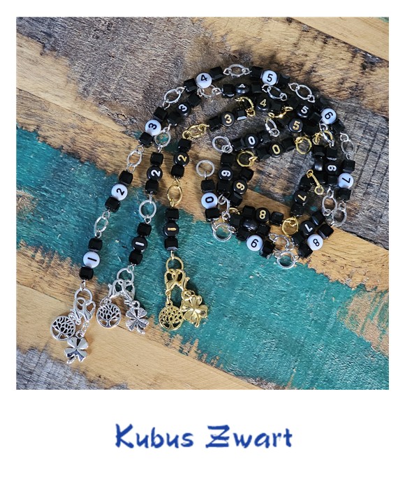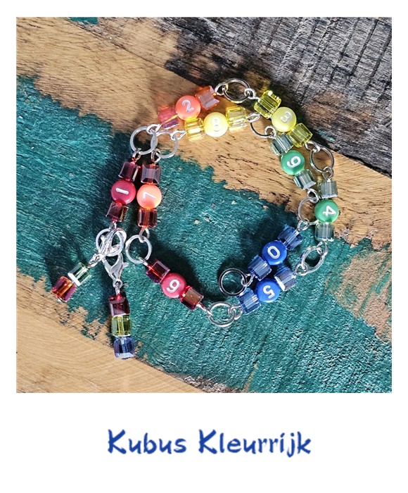 Like a Rainbow (€ 15,00), is gemaakt met glaskralen en gladde ringetjes. Ze is te gebruikten tot en met naald 6,5. Kubus Kleurrrijk (€ 15,00) is ook echt kleurrijk, zowel de 6mm kubus- als de cijferkraaltjes zijn gekleurd. De KubusZwart (€ 15,00) zie je hier op 3 verschillende manieren. Door het soort cijferkraal te veranderen zie je dat ook de uitstraling van de TTK totaal veranderd. de beide Kubus TTK’s zijn hier gemaakt met ringetjes geschikt t/m naald 5.