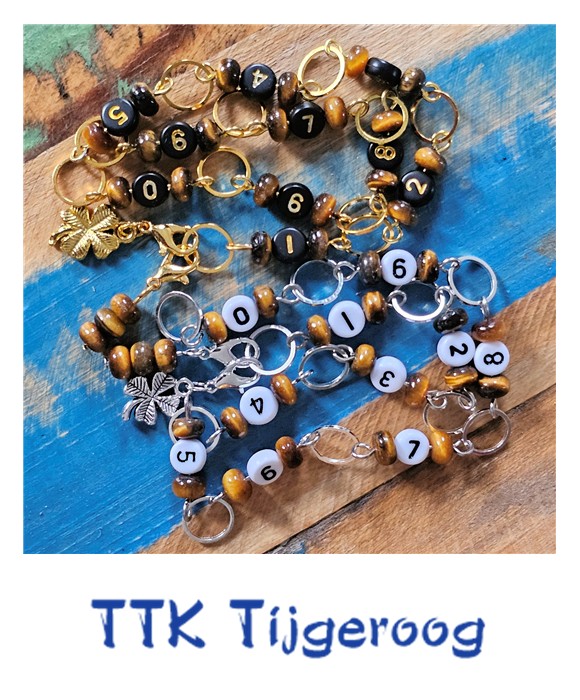 Tot slot de toeren-tel-ketting Tijgeroog, op de foto staan er twee. Twee zó verschillend, toch zijn ze met dezelfde kraal gemaakt. Het verschil is dat de ene goudkleurig met zwarte cijferkraal is gemaakt, de ander zilverkleurig met een witte cijferkraal. Ook deze TTK’s zijn te gebruikten tot en met naald 6,5 en kosten € 17,50 per stuk.