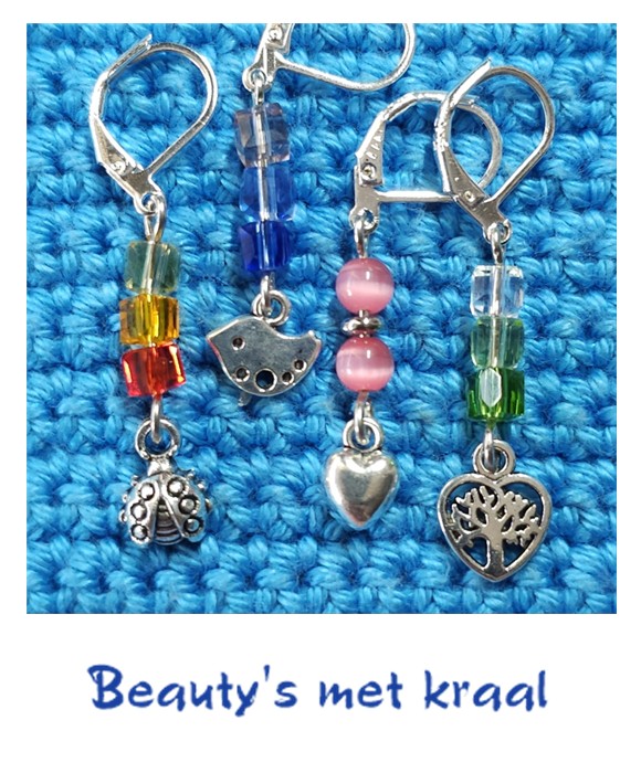 Nog meer steekmarkeerders met dubbele ‘aanhang’. Deze steekmarkeerders zijn iets minder exclusief (lees minder prijzig 🙃) De Bloem of Schelp met Kraal, is te gebruiken vanaf standaard garen, de Beauty’s met Kraal, zijn zelfs geschikt voor de nog iets dunnere draad. De gebruikte bedels zijn van de kleinste bedels in het assortiment gemaakt, ze wegen bijna niets. Deze steekmarkeerders kosten € 1,75 per stuk.