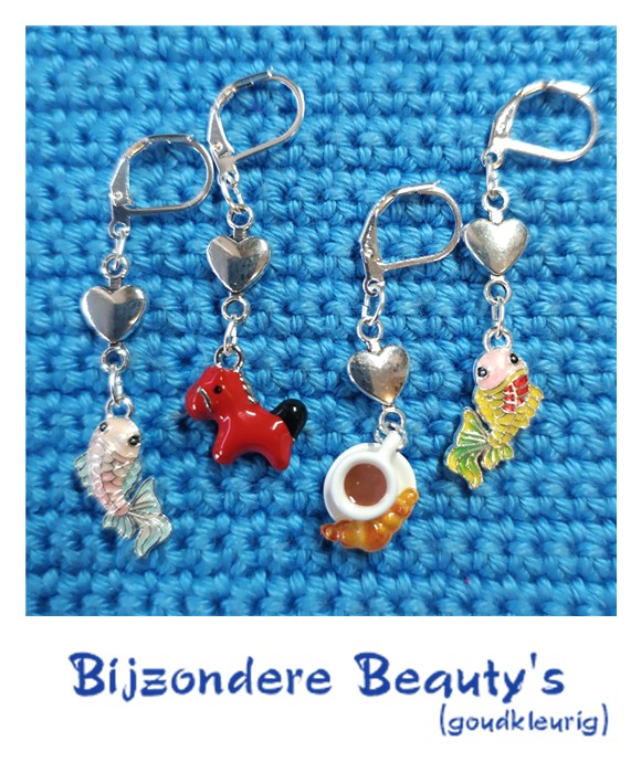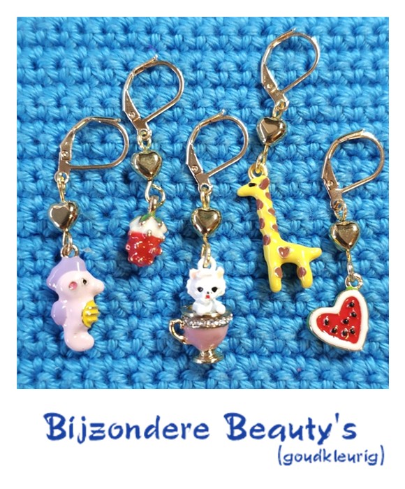 Deze Bijzondere Beauty’s hebben een kleine geëmailleerde en een goudkleurige hartje kraal of een zilverkleurige tussenbedel. Hiervoor worden kleine bedels gebruikt, door het gewicht zijn deze toch pas aan te raden vanaf standaard garen. De Bijzondere Beauty’s, zowel de goud- als de zilverkleurige, kosten € 2,25 per steekmarkeerder.